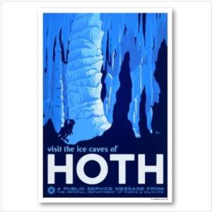 Since I love WPA-style posters, and I’m still (for now) in charge of decorating my kids’ rooms, a little propaganda piece encouraging travelers to visit the relocated Rebel base was my selection.