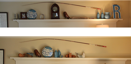 Using the vase as the focal point, I created groupings that followed the line of the pole. I weighted the center, and left the right side of the asymmetrical mantel empty, letting it sort of recede visually.